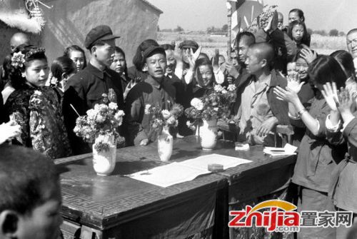 婚姻法实施后在农村里自由结婚的风气已很盛行。1952年11月9日,湖南省醴陵县白兔潭村农民全裕盛(中)和孙桂华(右)向区政府登记结婚,司法干部把结婚证书递给他们。