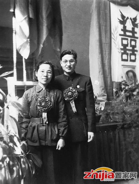 1957年春节,辽宁沈阳风动工具厂的工人鞠复海(新郎)和俞凤仙(新娘)在婚礼仪式上接受朋友们的祝贺。