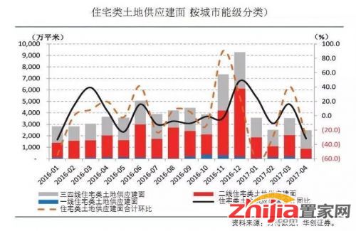 这50个城市在2016年全年合计卖地25409亿,2017年截至日前卖地金额相当于去年全年的33%。整体看,依然处于高位。地价同比依然上行,从土地供应量看,2017年前4个月,50大城市土地成交量同比上涨5.6%,3.34亿平方米。从土地的价格看,同比上涨了47.8%。从2017年前4月的城市土地市场看,北京上海等城市,土地成交溢价率在政策约束下有所降低。相比2016年平均单月超过30宗的表现,整体土地市场在政策的抑制下,虽然成交处于高位,但溢价率已经有下调的表现。