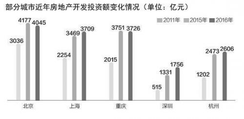 记者梳理发现,在国家统计局公布的35个主要城市中,2011年,北京、上海和重庆房地产开发投资额占据着前三位;到了2015年和2016年,北京、重庆、上海房地产开发投资额同样位列前三位。