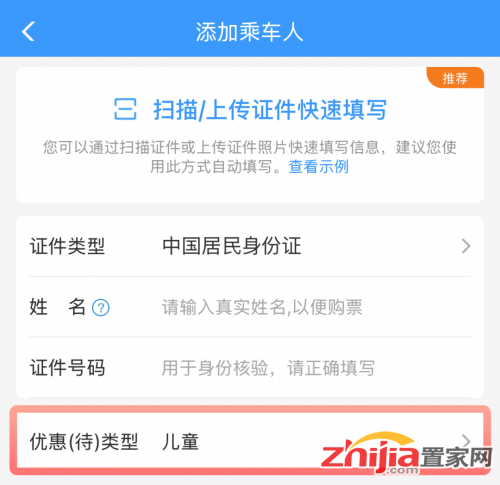 ② 按照提示添加乘车人信息,优惠(待)类型选择【儿童】。