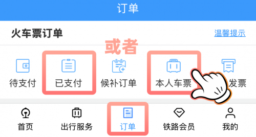 ① 成人旅客购票后,点击【订单】-【已支付】,也可点击【订单】-【本人车票】找到申报入口。